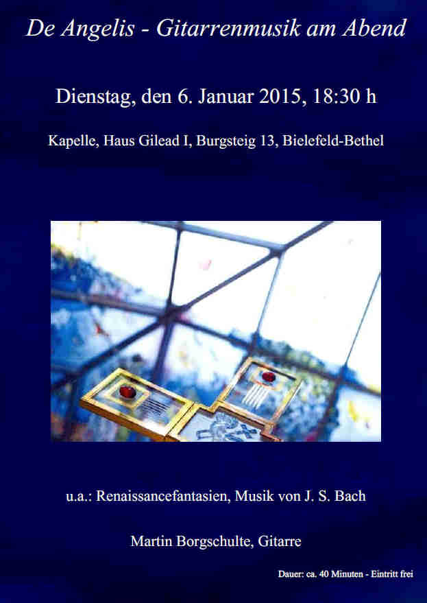 "nicht öffentlich" ___________________ Öffentliche Probe für´s "Deelenkonzert" am 16. Februar 2014, 18:00 h Gitarrenklänge im Foyer, Klinik Mara / Kidron Lesung - Dr. Jörg Bade liest aus seinem Buch: Bis das Leben zurückgekehrt ist - Ein Durchhaltebuch für Zeiten der Depression - 21. Januar. 2014 - 18.00-19.00 Uhr Kapelle Johannes-Wesling-Klinikum Minden Die Lesung wird von musikalischen Miniaturen auf der Gitarre begleitet. Martin Borgschulte / Gitarre