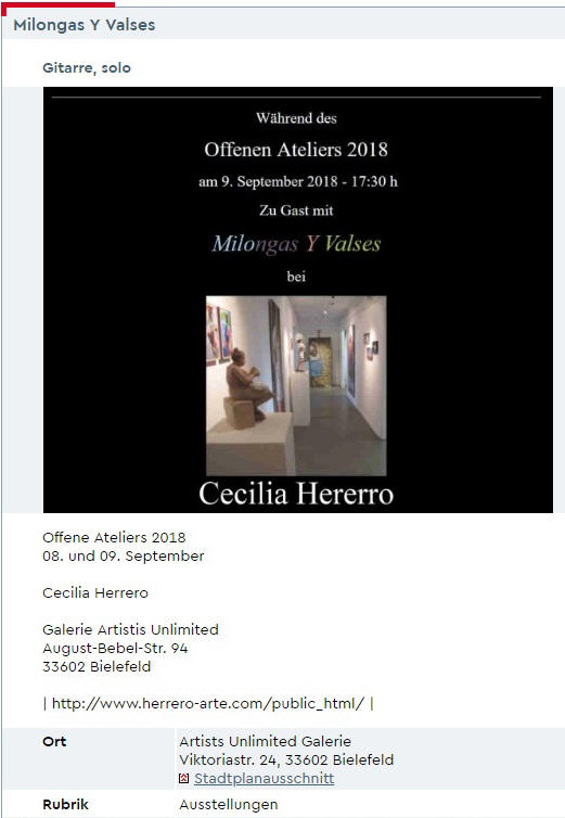 projektartgalerie | maria bernard 01.12.2011 - 18:30 h Der kleine Prinz Lesung und Musik Geschlossene Veranstaltung, Bielefeld Musik: Ponce - Folia-Variationen plus R. Pipo - Danza No. V 18.11.2011 , 19:00 h Kapelle Johannes-Wesling-Klinikum Minden Melancholie - ein Plädoyer für den November Konzertlesung mit Sonja Weichert, Minden Abendmusik/ Gitarrenrecital 16.08.2011 - 18:30 h bis ca. 19:10 h